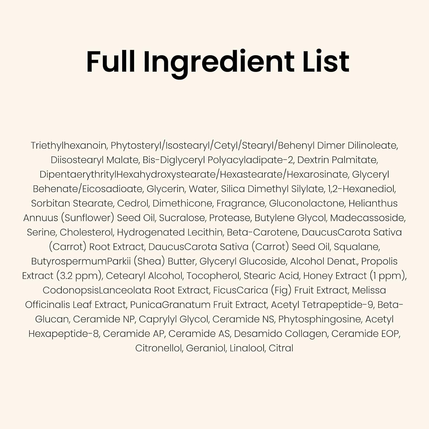 Triethylhexanoin, phytosteryl/isostearyl/cetyl/stearyl/behenyl dimer dilinoleate, diisostearyl maleate, bis-diglyceryl polyacyl adipate-2, dextrin palmitate, dipenta Erythrityl hexahydroxystearate/hexostearate/hexarozinate, glyceryl behenate/eicosadioate, glycerin, purified water, silica dimethyl silylate, 1,2-hexanediol, sorbitan stearate, cedar Roll, dimethicone, fragrance, gluconolactone, sunflower seed oil, sucralose, protease, butylene glycol, madecassoside, serine, cholesterol, hydrogenated lecithin, beta-carotene, carrot extract, carrot seed. Oil, squalane, shea butter, glyceryl glucoside, denatured alcohol, propolis extract (3.2 ppm), cetearyl alcohol, tocopherol, stearic acid, honey extract (1 ppm), Deodeok root extract, fig extract, lemon balm leaf extract, Pomegranate extract, acetyltetrapeptide-9, beta-glucan, ceramide NP, caprylyl glycol, ceramide NS